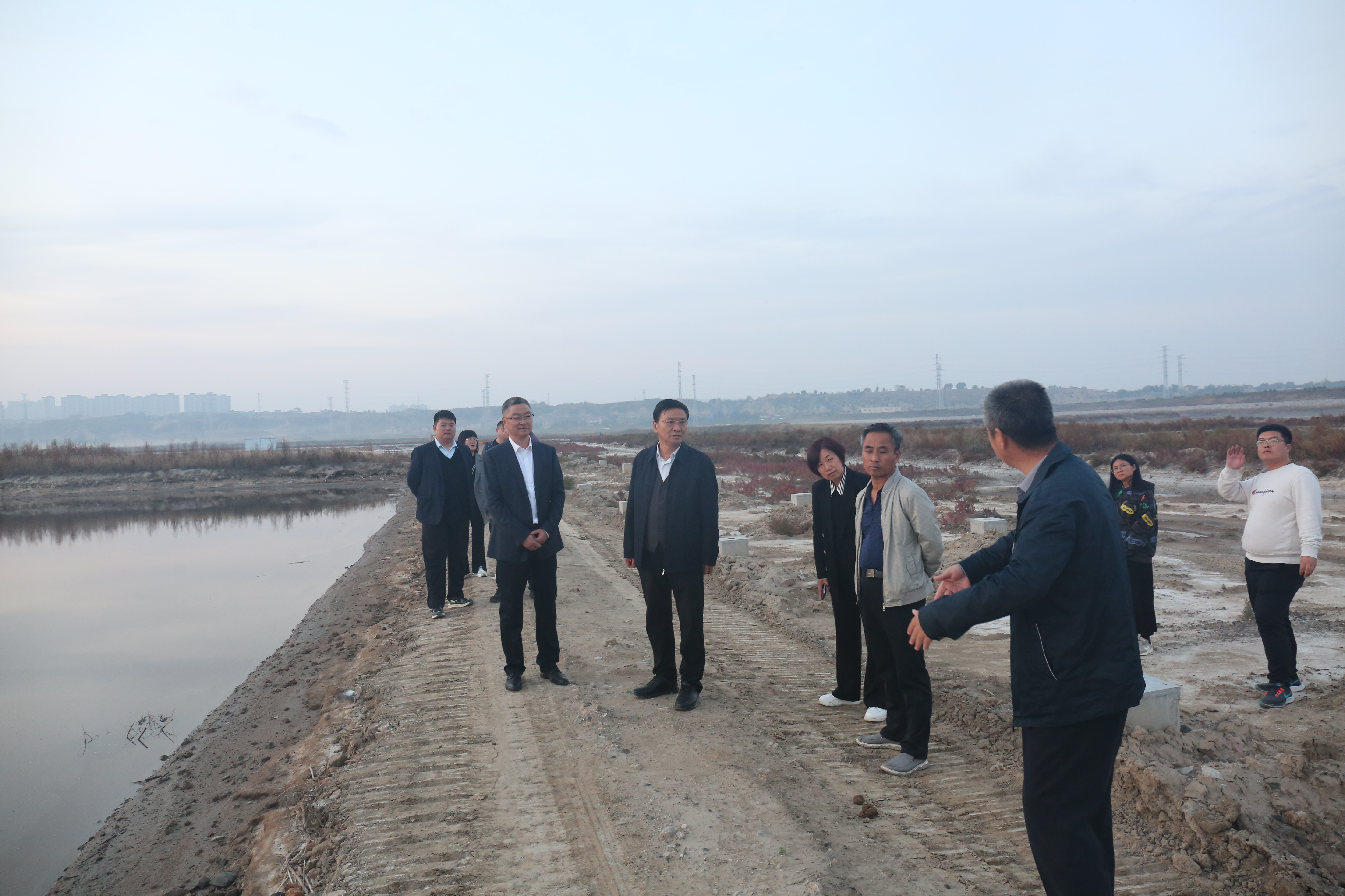 公司領(lǐng)導(dǎo)調(diào)研鹽湖堤埝治理項(xiàng)目(一期)木棧道施工現(xiàn)場